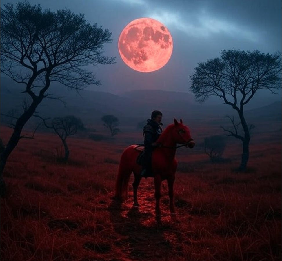 Upon the broken foundations of the earthquake, under a bloody moon, the Red Horse and its rider emerge. The Red Horse and its rider have the power to take peace from the earth, and people will kill one another.